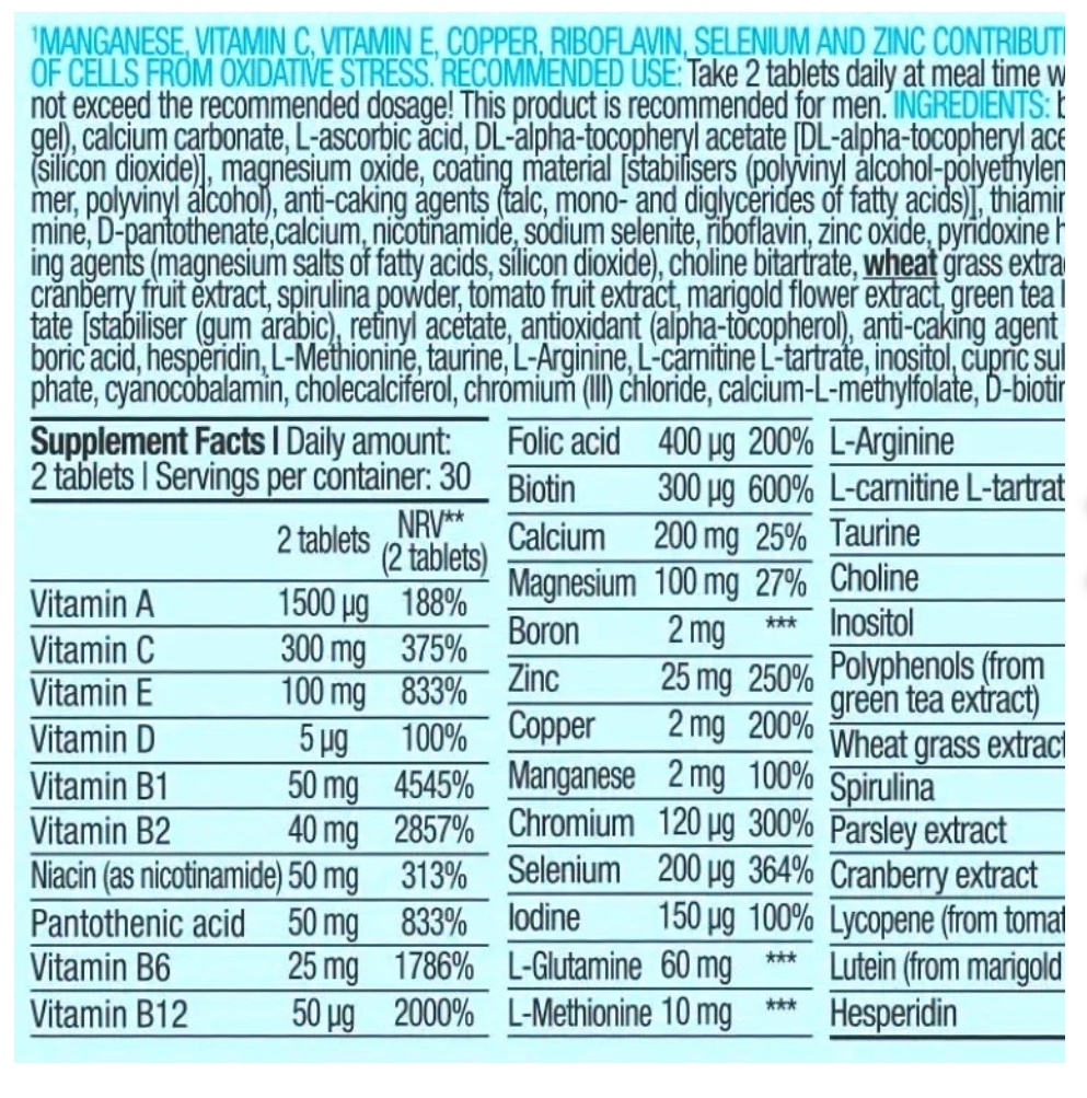 الفيتامينات المتعددة للرجال هو مكمل غذائي يحتوي على الفيتامينات والمعادن. يساعد في تكملة النظام الغذائي الصحي ويوفر العناصر الغذائية المتوازنة مثل الأحماض الأمينية، وأنواع مختلفة من مستخلصات الفواكه والخضروات، وأنواع متعددة من فيتامينات B، ومكونات مضادة للأكسدة تسهم في حماية الخلايا من التلف التأكسدي. من بين مستخلصات النباتات الأخرى، يحتوي المنتج على مستخلص عشبة القمح، والفلافونويدات من مستخلص الشاي الأخضر ومستخلص البرتقال المر كمصدر للفلافونويدات الحيوية.