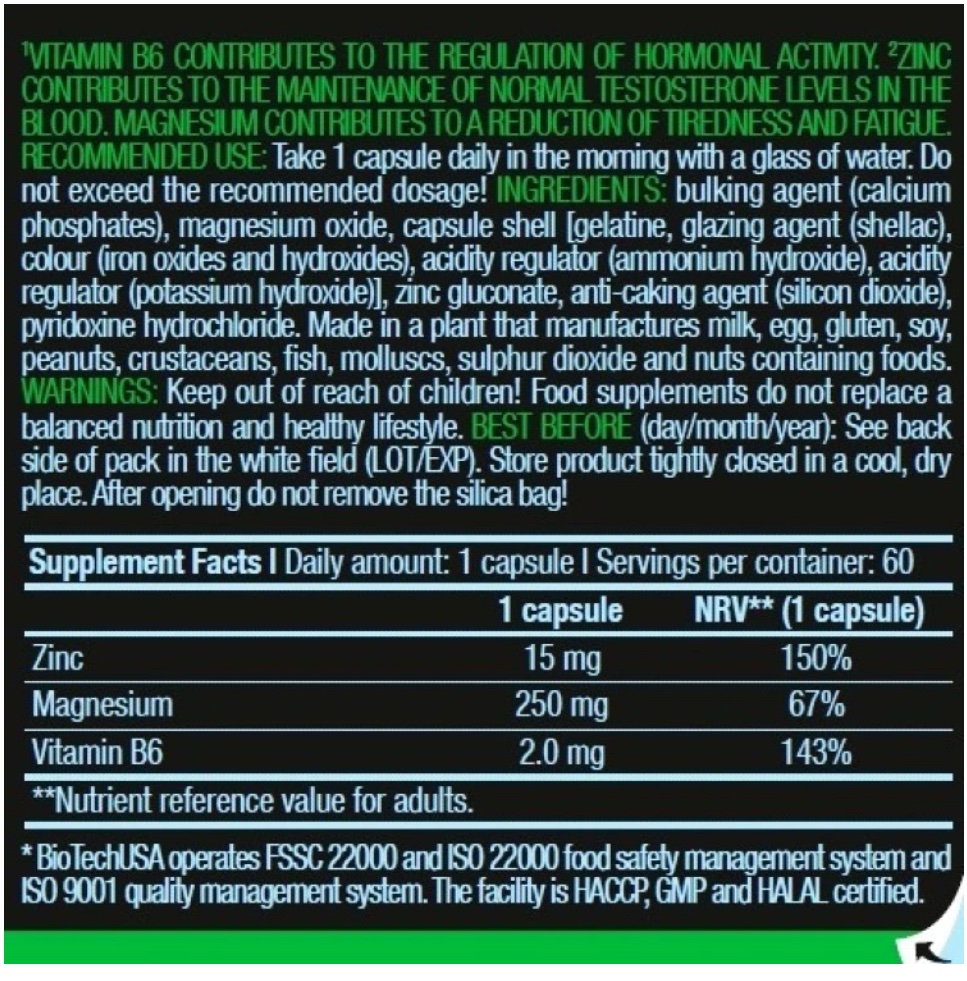 - ZMB يجمع بين الزنك والمغنيسيوم وفيتامين B6 بجرعات دقيقة وعالية في تركيبة واحدة. هذه المكونات ثبتت فعاليتها من خلال الدراسات العلمية. يعد هذا المكمل مفيدًا بشكل خاص للرجال الذين تزيد أعمارهم عن 30 عامًا، حيث ينخفض مستوى التستوستيرون مع مرور الوقت.