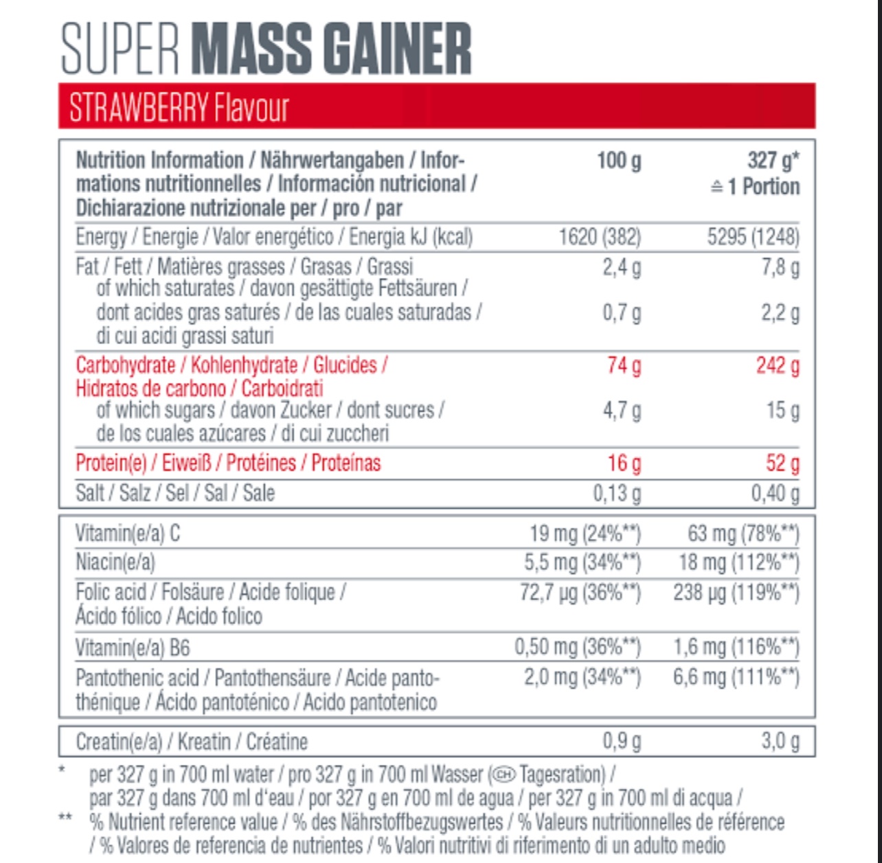 سوبر ماس جاينر يحتوي على تركيبة كاملة وفريدة تجعل منه منتجًا استثنائيًا معروفًا ومعترفًا به من قبل العديد من الرياضيين المحترفين والهواة. تحتوي كل حصة (327 جرامًا) على 1248 سعرة حرارية، وتشمل 7.8 جرام من الدهون (من بينها 2.2 جرام من الدهون المشبعة)، 242 جرامًا من الكربوهيدرات منها 18 جرامًا من السكريات، والتي تتكون بشكل رئيسي من المالتودكسترين. كما يحتوي على 52 جرامًا من البروتينات التي تتكون من مزيج من 4 أنواع من البروتينات: إيزوليت بروتين مصل اللبن، مركز بروتين مصل اللبن، كازين ميكسيلاير، و بروتين مصل اللبن المهدرج.