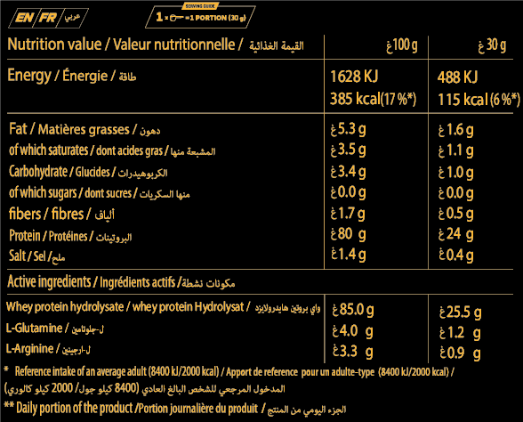 - البروتينات: يحتوي على نسبة بروتين عالية (80 غرام لكل 100 غرام) باستخدام بروتين مصل اللبن المهدرج النقي، مما يساهم في تعزيز بناء العضلات.