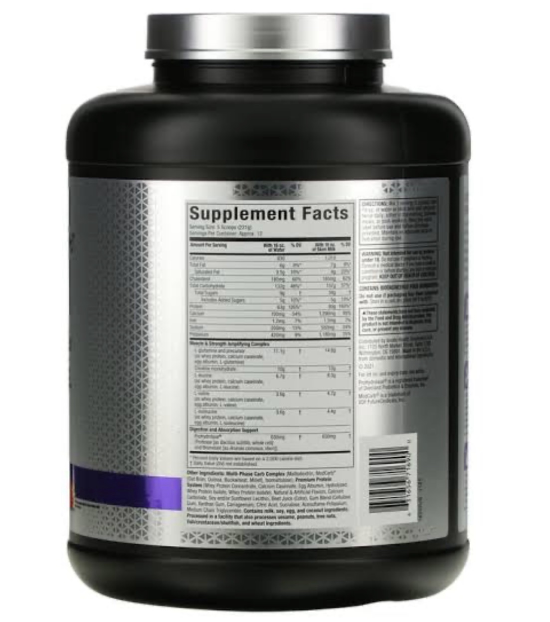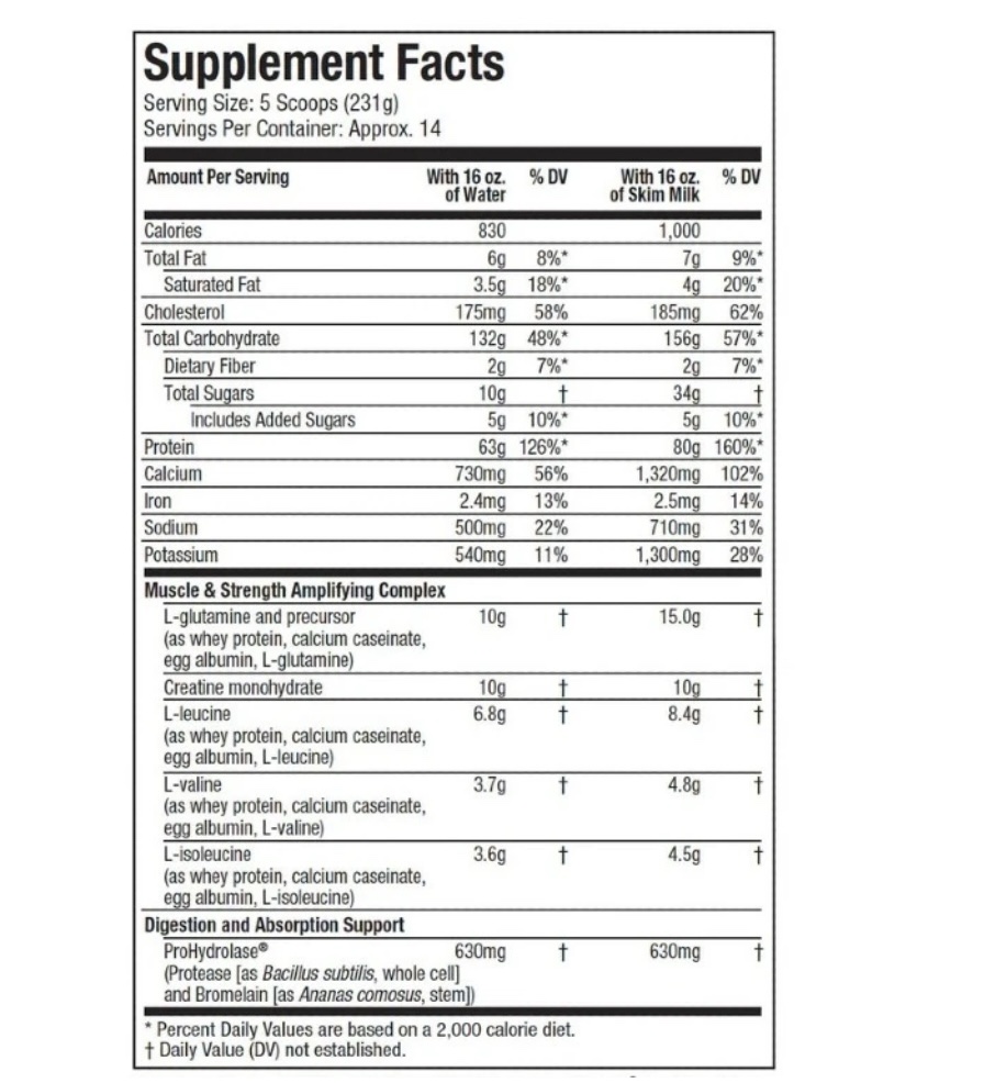 كل جرعة من 230 جرام (أي 5 مكيال) من ماس-تِك، والتي تحتوي على حوالي 864 سعرة حرارية حسب النكهة، تقدم مزيجًا من 63 جرامًا من البروتينات (بروتين مصل اللبن المركز، كازينات الكالسيوم، البيض، بروتين مصل اللبن المعزول، هيدروليزات بروتين مصل اللبن). وإذا تم خلطها مع 510 مل من الحليب الخالي من الدسم، فإنها توفر 80 جرامًا من البروتينات. كما تحتوي على 134 جرامًا من الكربوهيدرات، بما في ذلك 11 جرامًا من السكريات (والتي تتكون بشكل أساسي من المالتوديكسترين)، و10 جرامات من الكرياتين، و15غرام من BCAA (الأحماض الأمينية المتفرعة). و10 غرام من الغلوتامين.