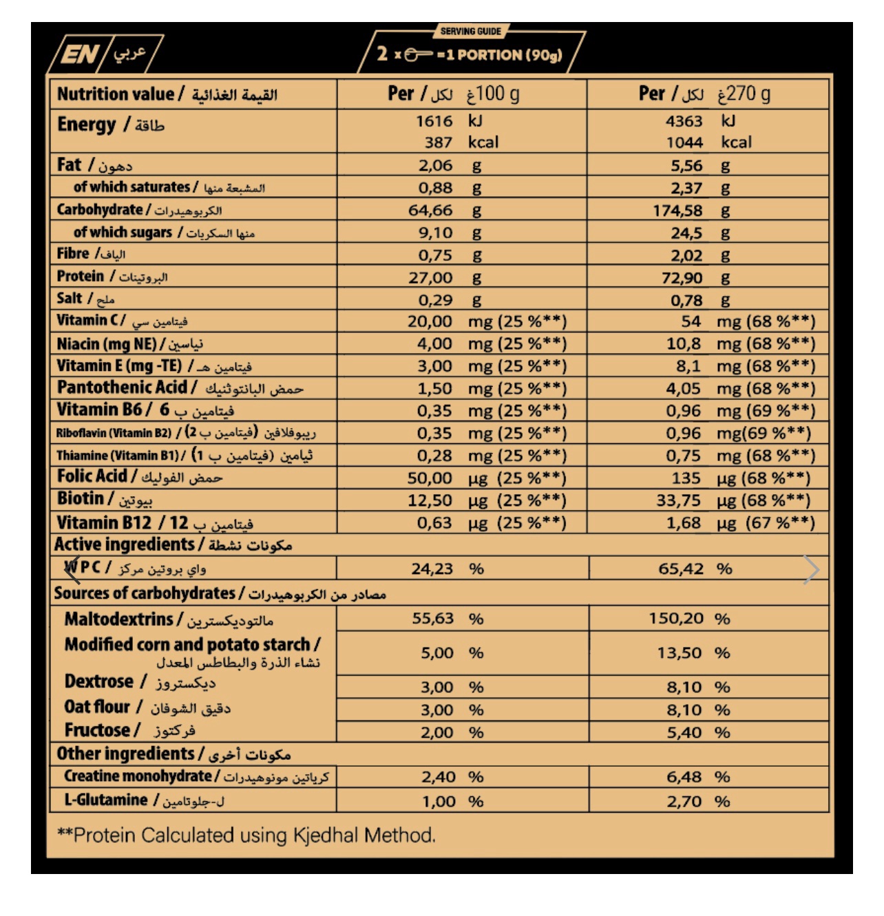 - مصادر الكربوهيدرات: مالتوديكسترين (55.63%)، نشا الذرة والبطاطس المعدل (5.00%)، ديكستروز (3.00%)، دقيق الشوفان (3.00%)، فركتوز (2.00%).