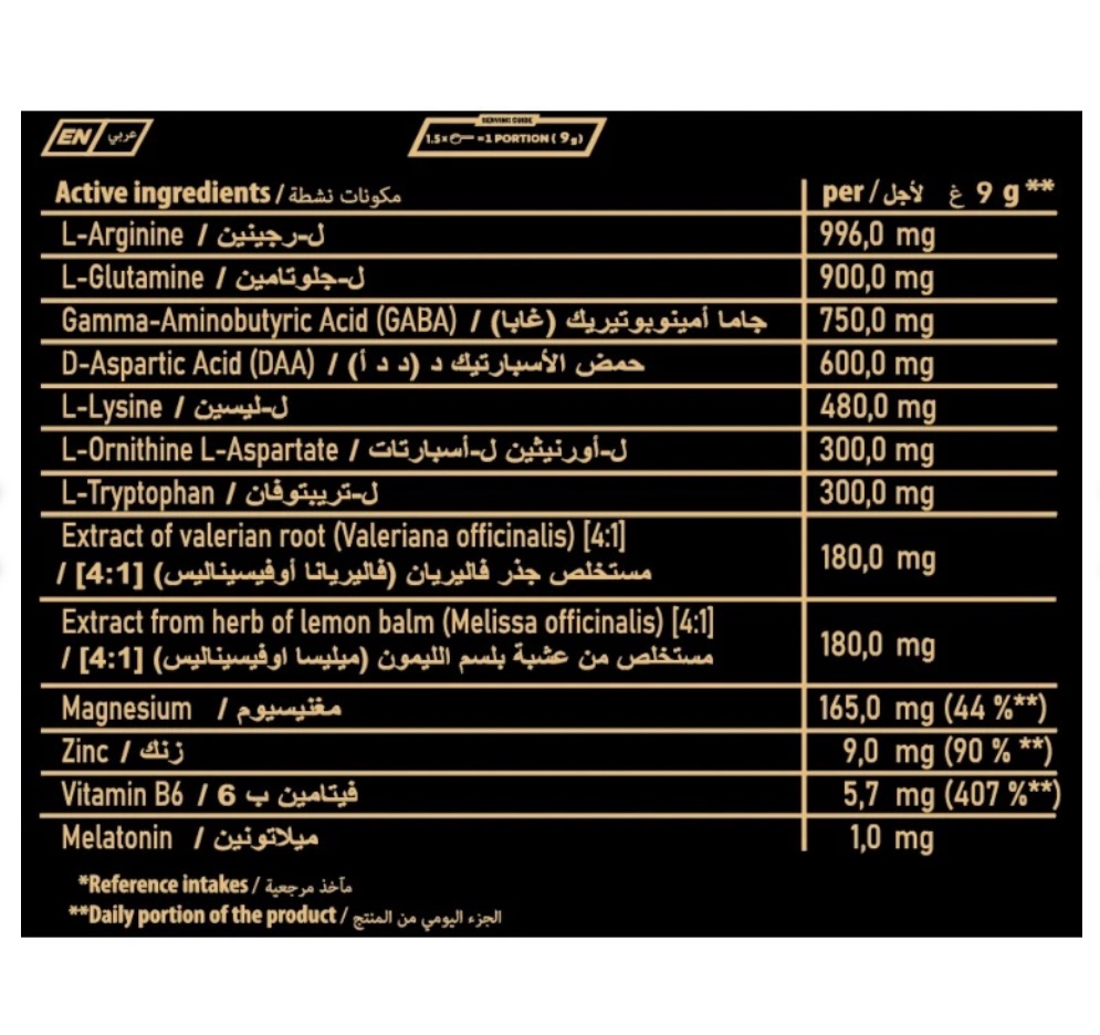 - دعم الاستشفاء العضلي: غني بـ ل-جلوتامين (900 ملغ) ول-أرجينين (996 ملغ) لتعزيز التعافي الليلي.