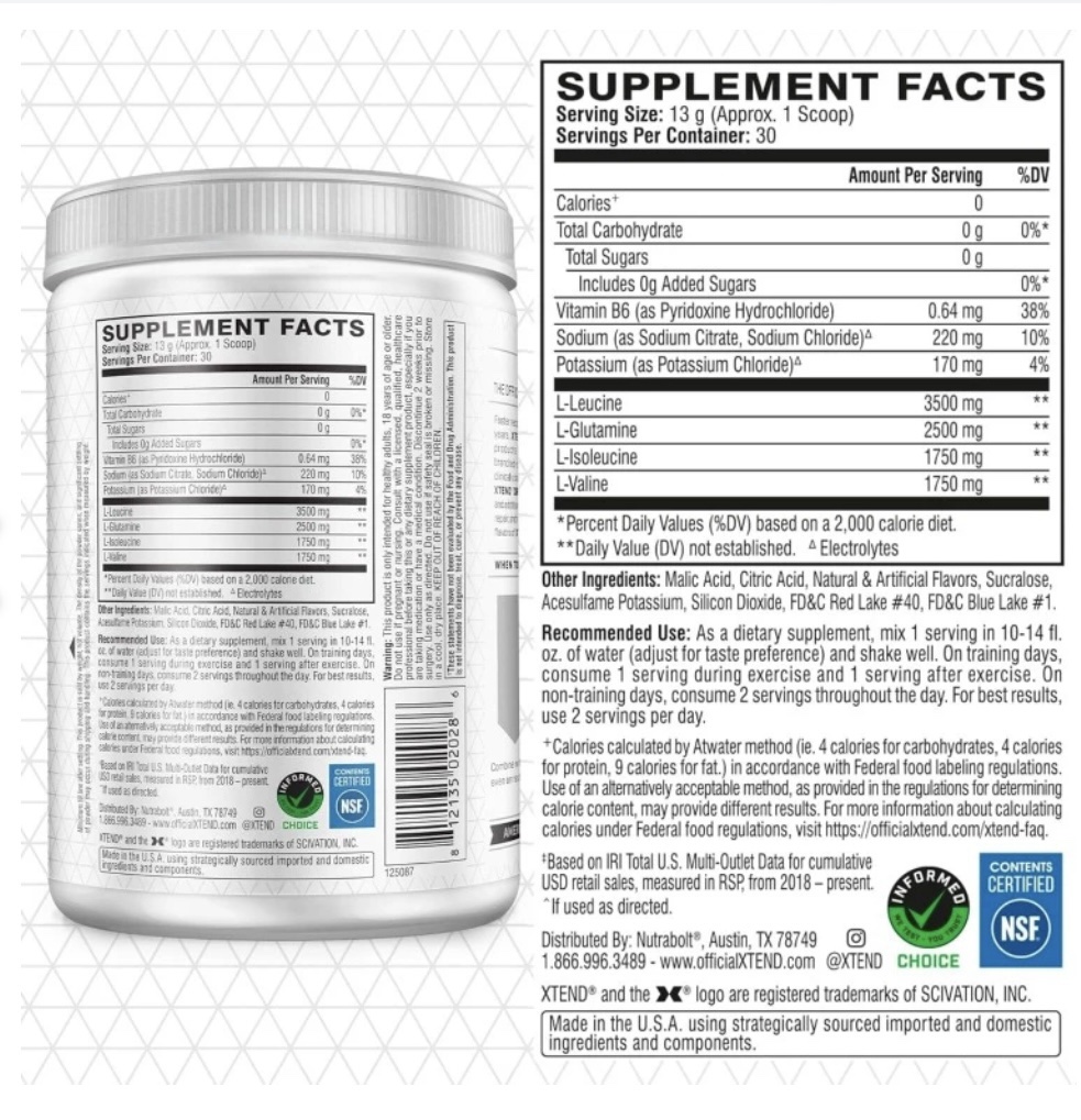 إكستند BCAA هو منتج يعتمد على العلم، ويحتوي على مكونات معروفة ومثبتة الفعالية. يتميز بتركيبة غنية وفريدة من نوعها، تضم الأحماض الأمينية المتفرعة السلسلة (BCAA)، إلى جانب العديد من العناصر الغذائية الأخرى.